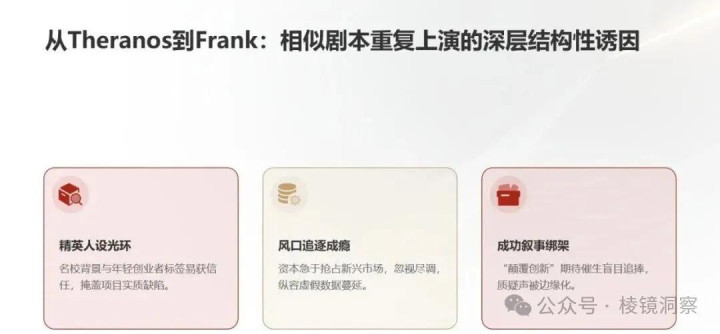 其实,“尽调不尽职”导致的惨痛教训,历史上早已发生过N次。从 Theranos(血检造假)到 FTX(资金链骗局),再到 Frank,每次都是同样的三角配方:极具魅力的创始人 + 精英圈的背书 + 市场的从众。这是一个重复的社会工程学问题,不只是一个尽调失败的问题。