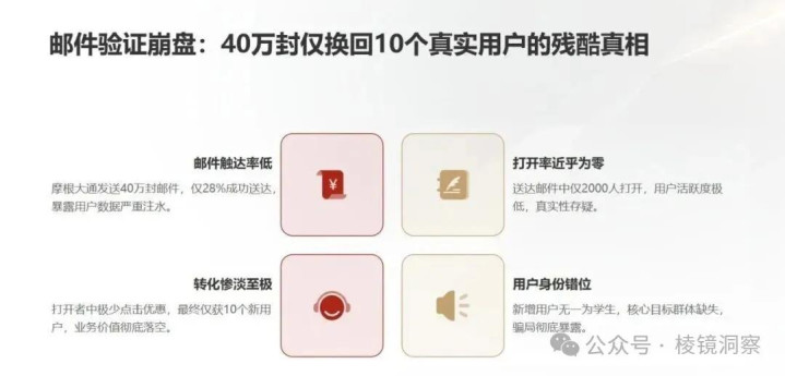但是收购后不到几个月,摩根大通发现Frank的用户大部分是假的,在进行营销发送邮件时,大量邮箱退信、用户数据对不上号,实际活跃用户不到 30 万;进一步调查显示,贾维斯先要求公司工程师伪造客户名单被拒后,转而花费1.8万美元聘请一名数据科学教授,编制了含400多万个假学生姓名的名单。